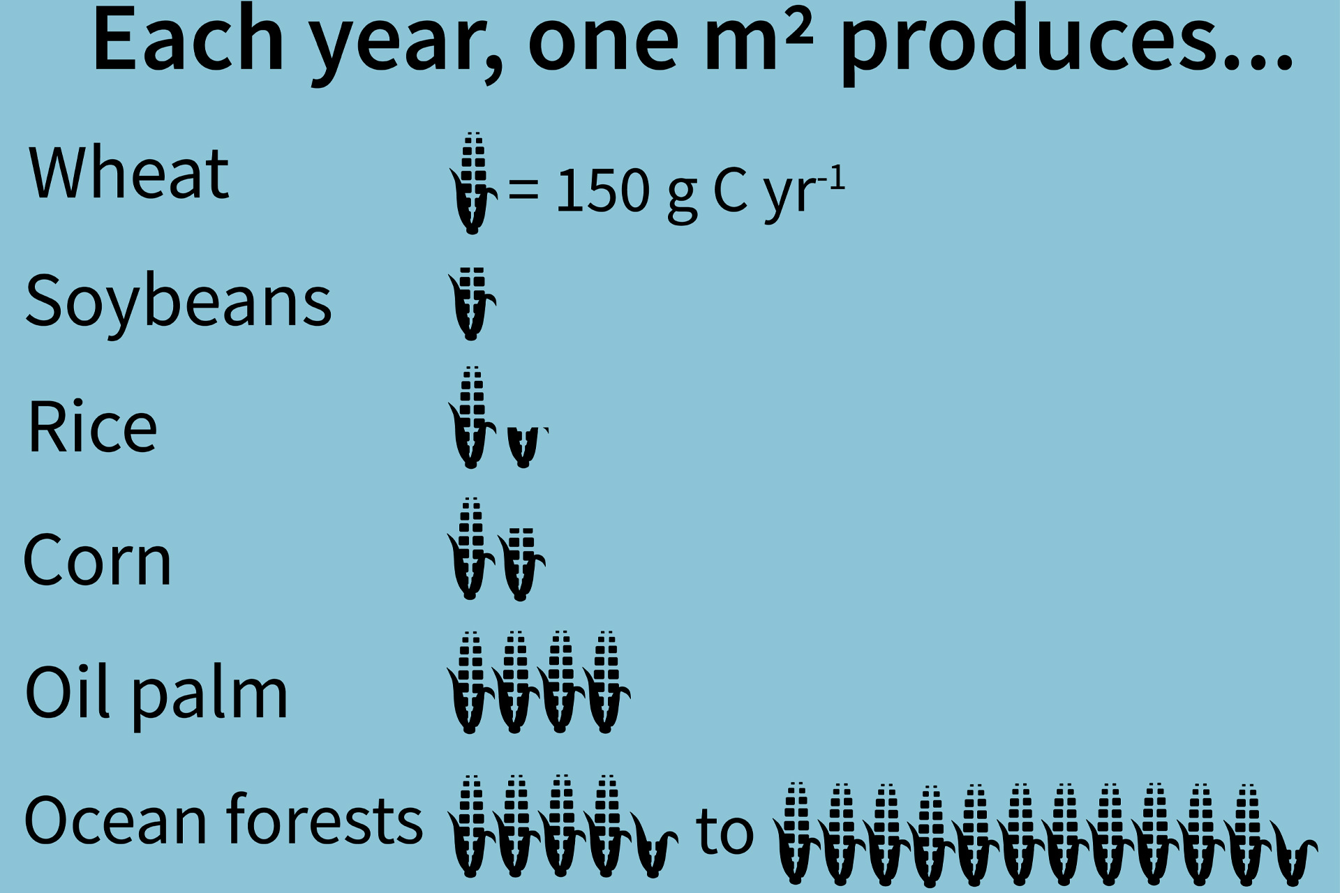 پس از بررسی اسناد مشخص شد جنگلهای اقیانوسی حتی نسبتبه شماری از محصولات پرحاصل کشاورزی نظیر گندم، ذرت و برنج نیز پرحاصلترند. بهرهوری در ناحیههای متعدل که بهطور معمول در آب خنک و غنی از مواد مغذی قرار دارند به بالاترین حد رسید. جنگلهای اقیانوسی در این ناحیهها هر سال بهطور میانگین دو تا ۱۱ برابر زیستتودهی بیشتر نسبتبه محصولات زراعی یادشده تولید میکنند.