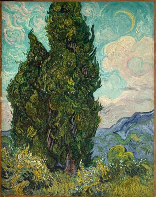 در نقاشیهای «ونگوگ»، درختان سرو بهطور مکرر دیده میشوند. او شکل کشیدهی آنها را دوست داشت و یکبار آنها را از نظر خطوط و تناسبات، «زیبا مانند یک ابلیسک مصری» توصیف کرد. او این اثر را در ژوئن ۱۸۸۹ خلق کرد، زمانی که در آسایشگاه روانی در سنترِمی بستری بود. درخت سرو، که اغلب بهخاطر حضورش در گورستانها بهعنوان نماد مرگ شناخته میشود، همچنین از ویژگیهای معمول مناظر طبیعی جنوب فرانسه است. درحالیکه ممکن است این موضوع بازتابدهندهی موضوعات تیره در ذهن ونگوگ باشد، «سروها» همچنین توانایی او در ایجاد زیبایی، انرژی و ریتم در منظره را نشان میدهد.