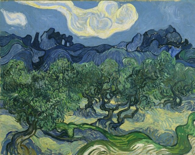 «ونگوگ» چندینبار درخت زیتون، درخت نمادین مدیترانه را در مدت اقامتش در «سنترِمی» را به تصویر کشید. در «درختان زیتون»، کل صحنه به نظر میرسد که در حرکت است: زمین مانند امواج اقیانوس جریان دارد و درختان زیتون در برابر کوههای آبی موجدار و آسمان پر از ابر، پیچوتاب میخورند. جالب اینکه بر اساس نامههایش، ونگوگ این نقاشی را نسخهی روزانهی اثر معروفش «شب پرستاره» میدانست.