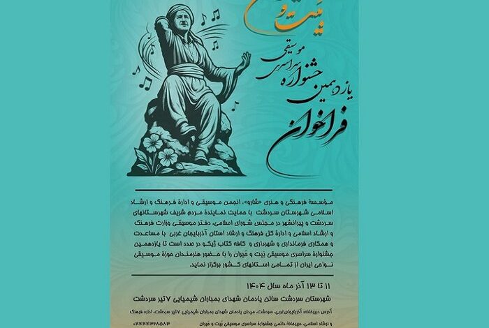 به گزارش هفت گرد به نقل از روابط عمومی جشنواره، یازدهمین دوره جشنواره سراسری موسیقی «بَیت و حَیران» به دبیری حسن حسنزاده از ۱۱ تا ۱۳ آذرماه امسال در شهرستان سردشت آذربایجانغربی برگزار میشود. این رویداد در دو بخش رقابتی و غیررقابتی با حضور هنرمندان موسیقی نواحی از سراسر کشور برپا خواهد شد.