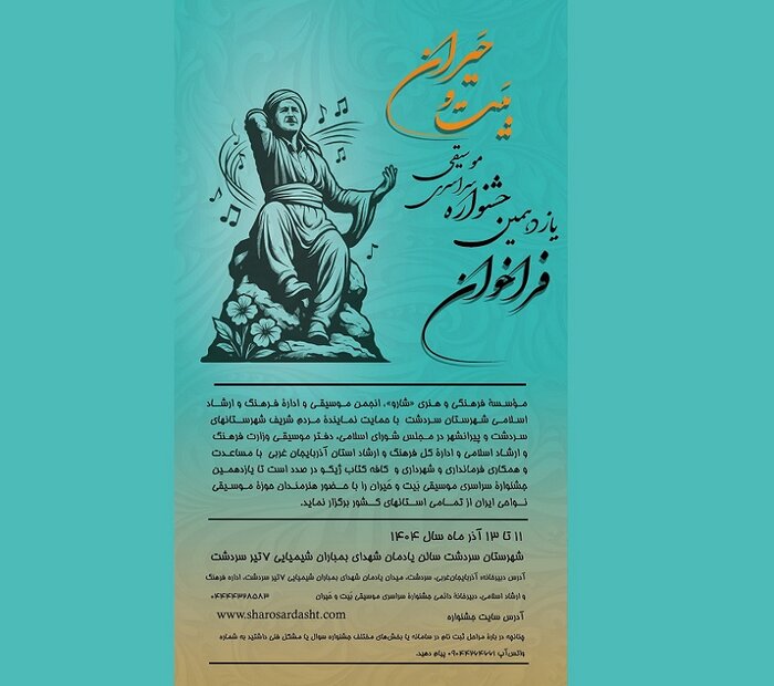 به گزارش هفت گرد به نقل از روابط عمومی جشنواره، یازدهمین دوره جشنواره سراسری موسیقی «بَیت و حَیران» به دبیری حسن حسنزاده از ۱۱ تا ۱۳ آذرماه امسال در شهرستان سردشت آذربایجانغربی برگزار میشود. این رویداد در دو بخش رقابتی و غیررقابتی با حضور هنرمندان موسیقی نواحی از سراسر کشور برپا خواهد شد.