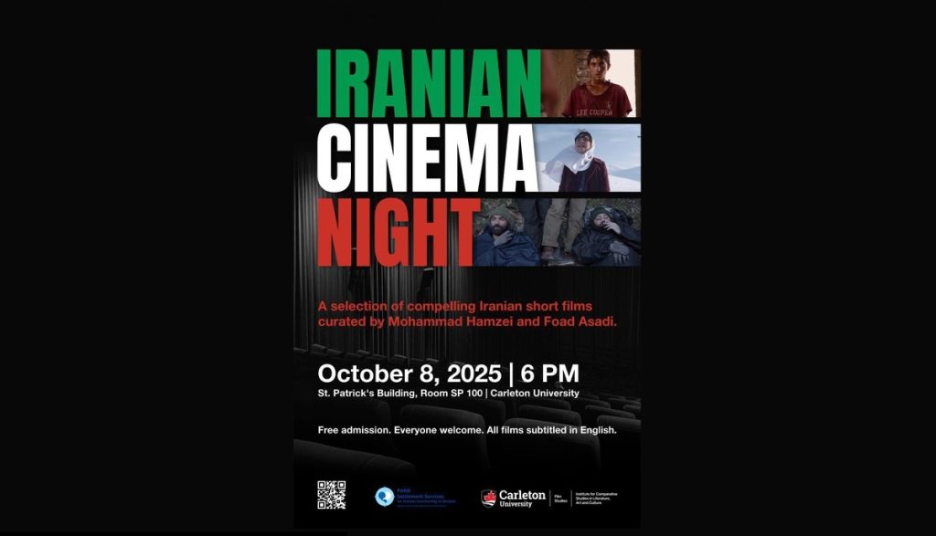 به گزارش هفت گرد،نمایش منتخبی از فیلمهای کوتاه سینمای ایران، روز چهارشنبه ۱۶ مهر برابر با ۸ اکتبر ساعت ۱۸ در دانشگاه کارلتون (Carleton University) شهر اتاوا برگزار خواهد شد.