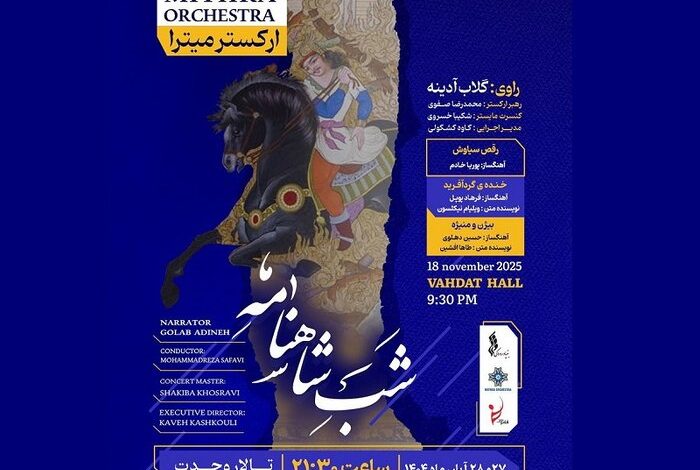 کنسرت ارکستر «میترا» با عنوان «شب شاهنامه» سهشنبه ۲۷ و چهارشنبه ۲۸ آبان ساعت ۲۱:۳۰ در تالار وحدت برگزار میشود.