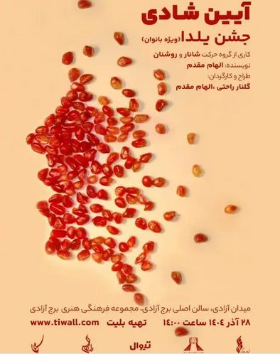 به گزارش هفت گرد، نمایش آیینی حرکتی «آیین شادی» همزمان با فرارسیدن شب یلدا روز جمعه ۲۸ آذر ماه به نویسندگی الهام مقدم، طراحی و کارگردانی گلنار راحتی و الهام مقدم از ساعت ۱۴ در سالن اصلی برج آزادی به روی صحنه میرود.